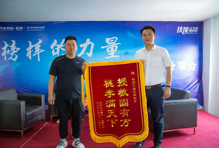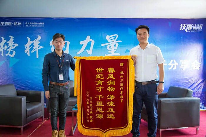 在此,特别额鸣谢王政保和张宗瀛两名优秀学子赠送杭州万通汽车学校的锦旗。杭州万通不负众望,努力让每一位学子走向成功。